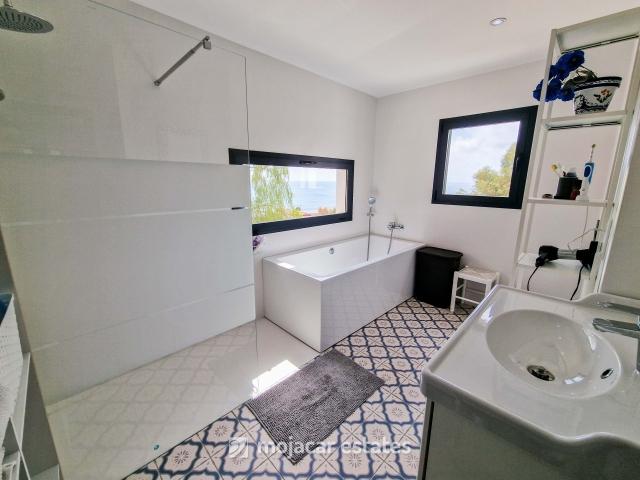 Baño: Disfrute de la comodidad de un baño bien equipado, completo con ducha y bañera y amplios ventanales para disfrutar de las hermosas vistas al mar.